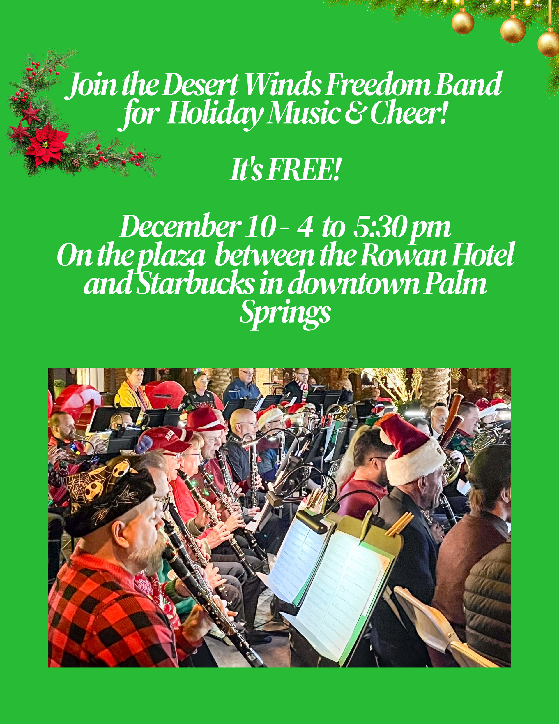 Through music, the Desert Winds Freedom Band connects people, celebrates diversity, and fosters inclusion. With roots in the LGBTQIA+ community, we welcome everyone, focusing on performance and education to make music accessible to all throughout greater Palm Springs area and beyond.